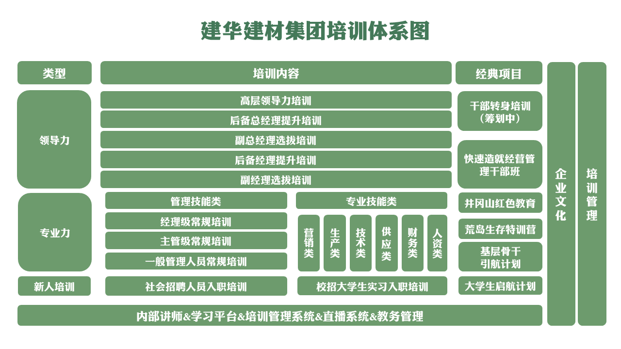 (2)線下平台包括集團建(jiàn)華學院集中組織的培訓(xùn)項目以及各子(zǐ)公司定期舉辦的個性化培訓。