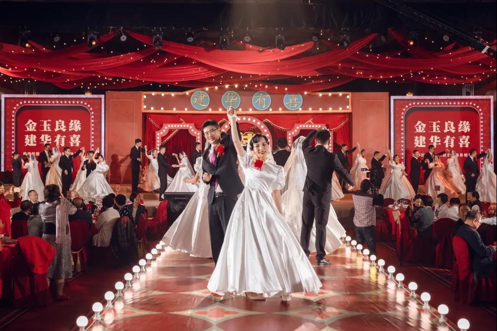 22對新人在鼓舞飛揚的(de)開場(chǎng)舞中步入(rù)婚禮殿堂,幸福喜悅(yuè)在每(měi)個人臉上洋溢。